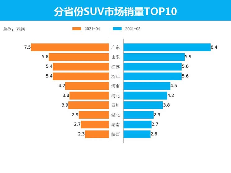 5月SUV销量最高的5个省份为广东、山东、江苏、浙江、河南,销量分别为8.4万辆、5.9万辆、5.6万辆、5.6万辆、4.5万辆,占总销量的38.0%,其中广东销量占比较4月相比增长0.7%。与4相比,销量上涨幅度最高的三个省分别为广东、海南、甘肃,上涨幅度分别为0.7%、0.3%、0.3%。