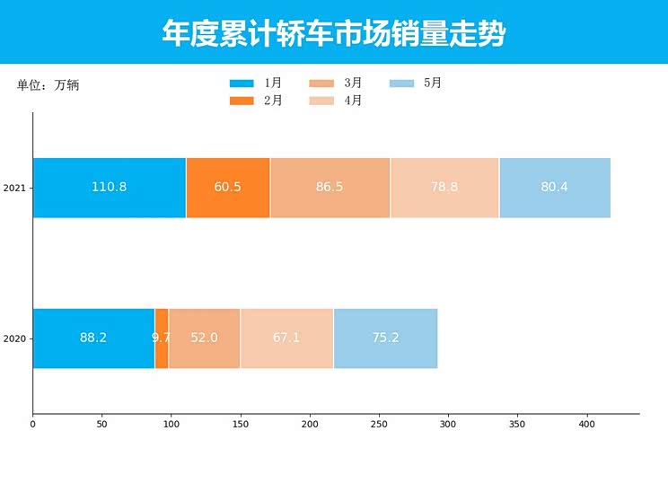 从累计销量数据来看,2021年1-5月,轿车累计销量416.9万辆,同比累计上涨43%。较去年累计情况相比,轿车累计销量增幅上涨74%。