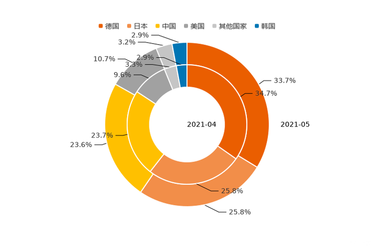 从国别情况来看,5月中国品牌轿车销量占轿车整体销量的23.6%,环比4月下降0.1%。德国、日本、美国、韩国和其他国家乘用车分别占乘用车销量的33.7%、25.8%、10.7%、2.9%和3.2%。与上个月相比,中国、其他国家、德国品牌销量占比皆有所下降,尽管德国品牌销量占比有所下滑,但依旧受消费者所青睐。