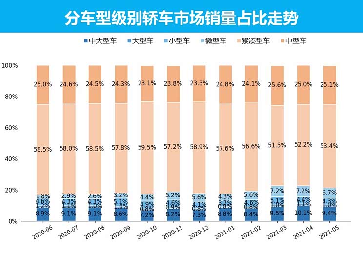 5月轿车销量占比最高的车型级别为紧凑型车,销量为43.0万辆,销量占比为53.4%,比4月增长1.3%;与去年同期相比,下降6%,轿车车型级别中销量占比排在第二的是中型车,销量为20.2万辆,销量占比为25.1%,比4月增长1.3%;与去年同期相比,增长1%,从轿车的具体车型级别来看,用户对紧凑型车、中型车有一定的偏爱。轿车的其他车型级别中,中大型车、大型车、小型车、微型车销量占比较4月有所下滑,中型车、紧凑型车较4月相比实现销量份额的提升。