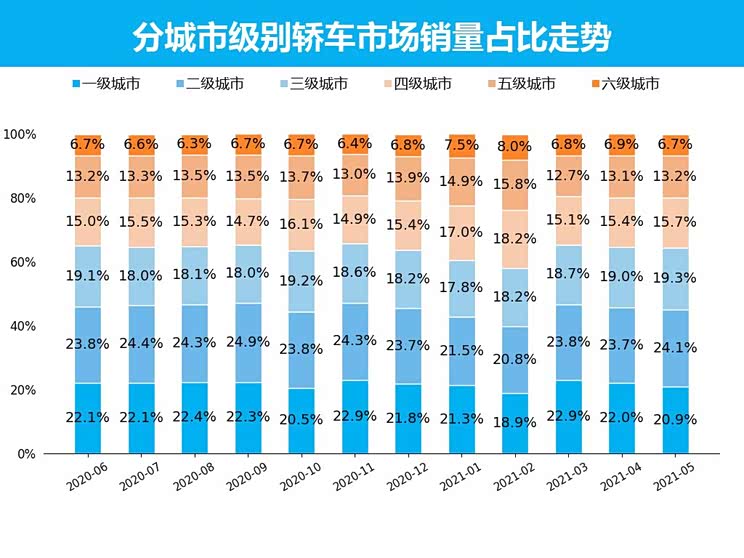 5月轿车销量最高的城市级别为二级城市,销量为19.3万辆,销量占比为24.1%,比4月增长0.4%;与去年同期相比,增长0.5%,一线城市人口规模大,消费能力强,同时限购政策也导致需求更加平稳。一级城市、六级城市销量占比较4月有不同程度的下滑,三级城市、二级城市、五级城市、四级城市较4月相比实现销量份额的提升。