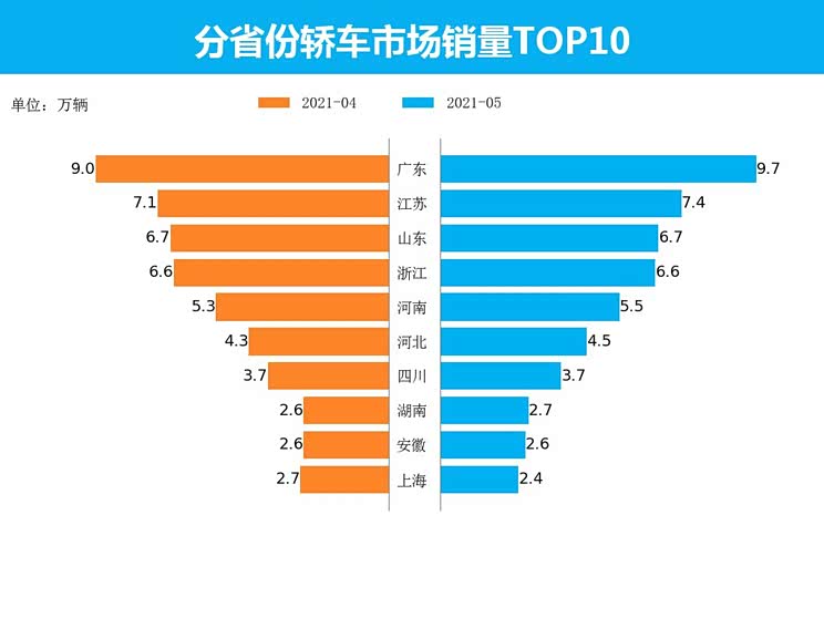 5月轿车销量最高的5个省份为广东、江苏、山东、浙江、河南,销量分别为9.7万辆、7.4万辆、6.7万辆、6.6万辆、5.5万辆,占总销量的45.0%,其中广东销量占比较4月相比增长0.7%。与4相比,销量上涨幅度最高的三个省分别为广东、广西、云南,上涨幅度分别为0.7%、0.2%、0.2%。