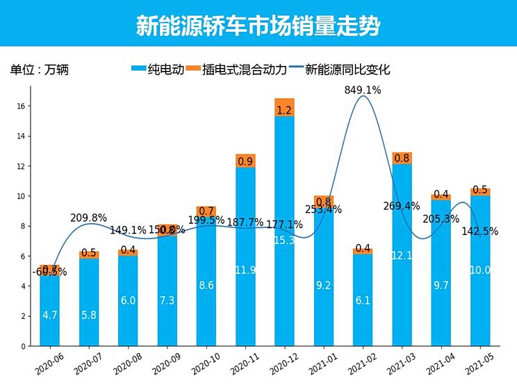 从能源类型角度来看,5月新能源轿车销量为10.5万辆,环比上涨4%,同比上涨142%,与4月相比,同比增幅收窄63%。其中,纯电动车销量为10.0万辆,环比增长3.5%,纯电动车仍占据着新能源车的主要市场份额;插电式混和动力车型的销量为5011辆,环比增长14.4%,同比下降9%。
