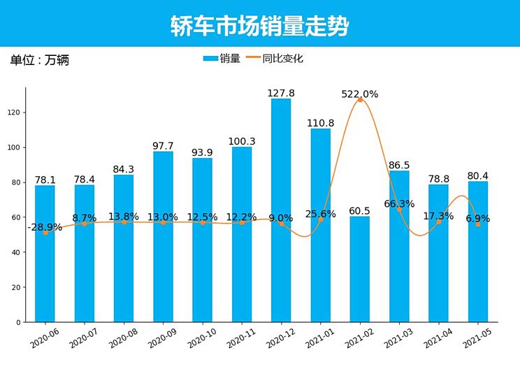 行业国内轿车市场在2021年5月的销量成绩已经出炉。5月轿车共销售80.4万辆,占整体乘用车市场的48.4%。让我们一起来看一下4月轿车市场销量走势分析。