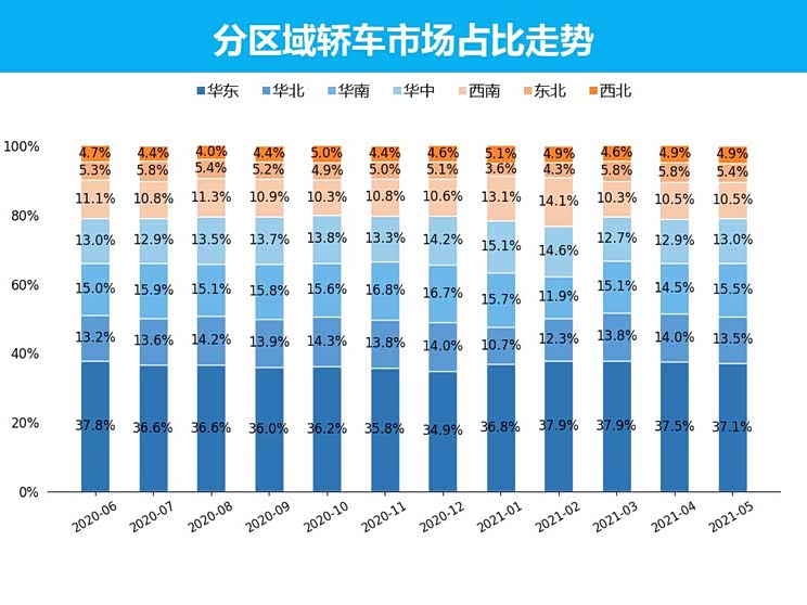 七.分区域轿车市场销量走势:华东、华南、华北地区销量总占比达到66.0%