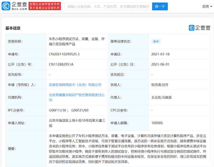 资讯 近日,我们从企查查APP获悉,百度在线网络技术(北京)有限公司公开专利“车机小程序测试方法、装置、设备、存储介质及程序产品”,专利公开号为CN112882951A。