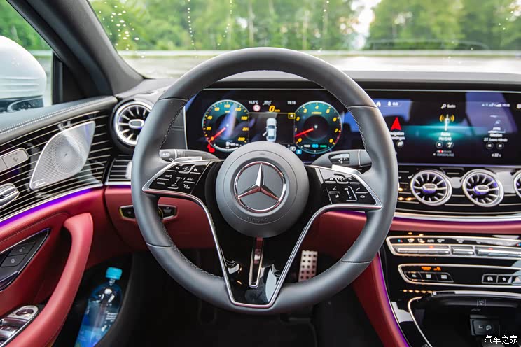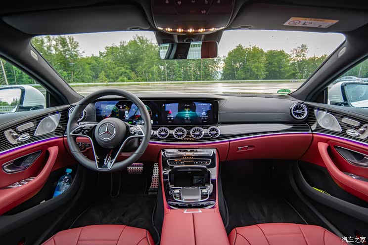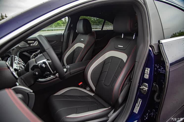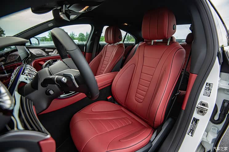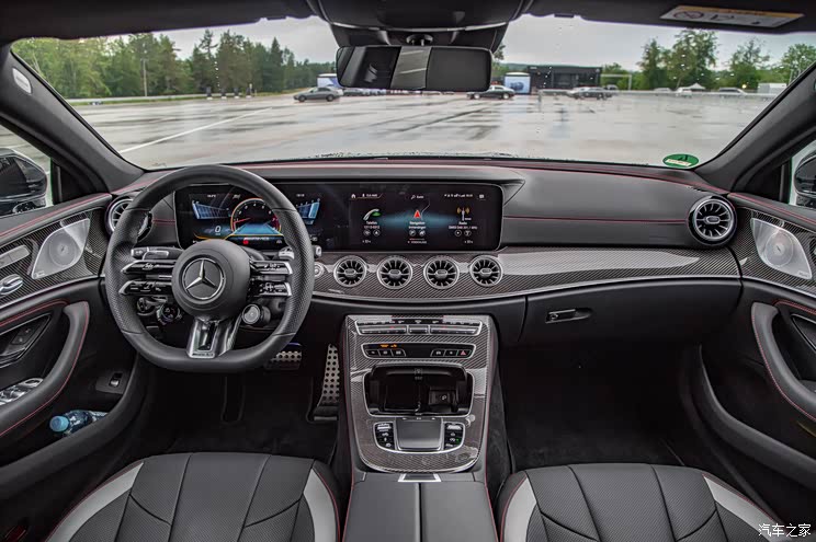 作为中期改款,新车的内饰造型升级并不明显,继续使用奔驰双连屏幕和奔驰MBUX信息互联系统。但配备有全新的Nappa真皮方向盘,这与现款E级和S级保持一致。新款梅赛德斯-AMG CLS 53 4MATIC+则更换了最新的AMG专属方向盘,同时大面积的碳纤维装饰板和红色缝线工艺,衬托出极强的运动氛围。