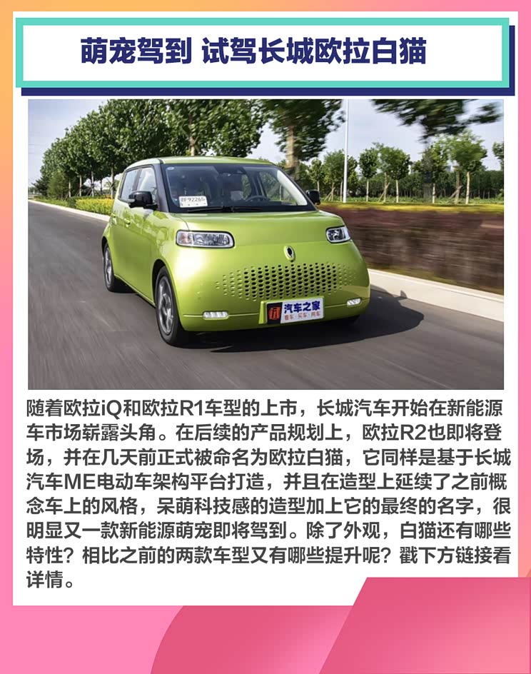 新能源周刊每周一更,不见不散,新能源周刊汇集本周精彩内容,一次看过瘾!本周萌宠驾到,点燃你的少女心,测试长城欧拉白猫/新宝骏E300(参数|询价)Plus,除了外观个性,回头率爆表,还有哪些亮点;马斯克与他的特斯拉,总能隔三差五的以各种形式登上新闻头条,最近又有哪些热点?为何说马斯克除了造车玩火箭,还想改造“人类”;唐DM车主聊真香体验,为何说这车不太适合驾驶狂野的人呢?精彩内容点击查看>>>新能源周刊vol.53