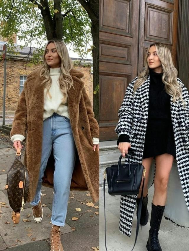 如果你选择的大衣在面料的设计上比较蓬松厚重的话,在穿搭的时候就不要太保守了,用适度敞开的穿衣方式可以打消整体搭配上的厚重感与臃肿感,比如像模特这样使用敞开的穿衣方式来露出内搭和腰线,既显高又显瘦。
