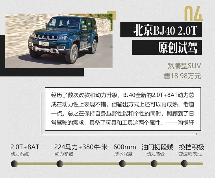 >>>点击查看《全新2.0T+8AT 试驾2020款北京BJ40 2.0T》<<<