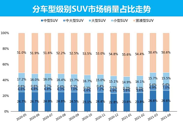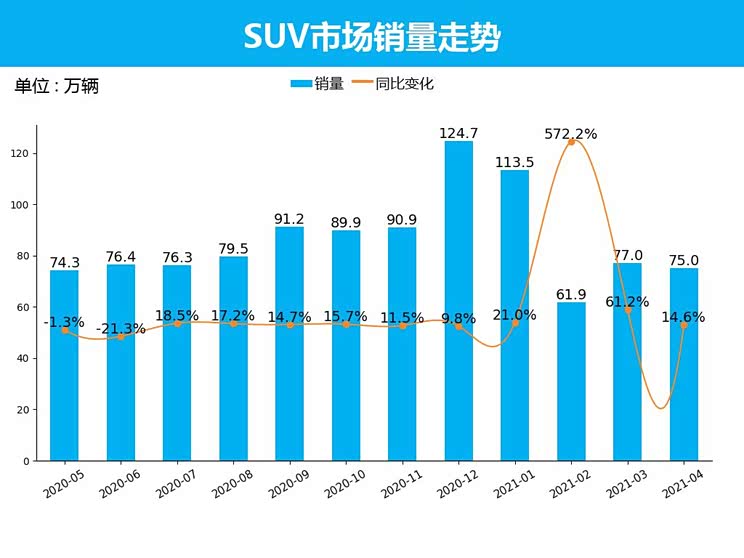 行业国内SUV市场在2021年4月的销量成绩已经出炉。2021年4月SUV共销售75.0万辆,占整体乘用车市场的46.4%。让我们一起来看一下4月SUV市场销量走势分析。