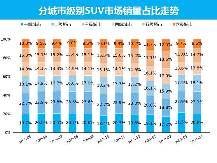 4月SUV销量最高的城市级别为二级城市,销量为17.3万辆,销量占比为23.1%,比3月增长0.2%;与去年同期相比,增长0.3%,一线城市人口规模大,消费能力强,同时限购政策也导致需求更加平稳。一级城市、五级城市、六级城市销量占比较3月有不同程度的下滑,三级城市、二级城市、四级城市较3月相比实现销量份额的提升。