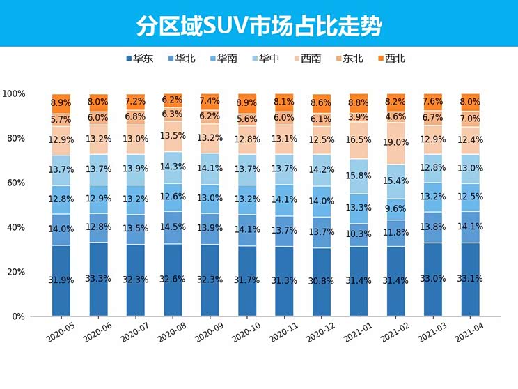 七.分区域SUV市场销量走势:华东、华北、华中地区销量占比呈增长趋势