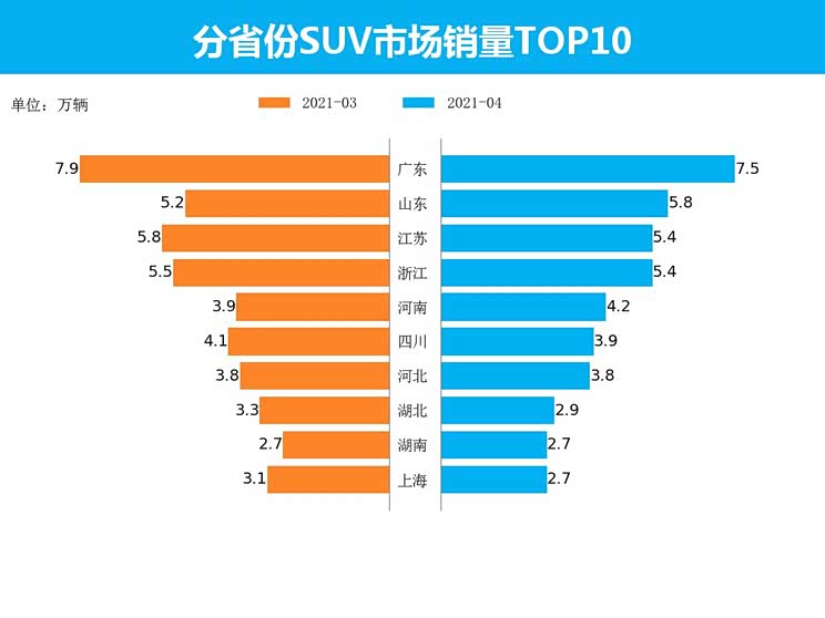 4月SUV销量最高的5个省份为广东、山东、江苏、浙江、河南,销量分别为7.5万辆、5.8万辆、5.4万辆、5.4万辆、4.2万辆,占总销量的38.0%,其中广东销量占比较3月相比下降0.2%。与3相比,销量上涨幅度最高的三个省分别为山东、河南、辽宁,上涨幅度分别为1.0%、0.5%、0.2%。