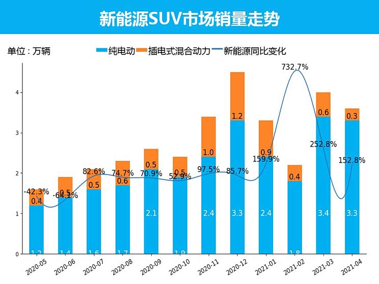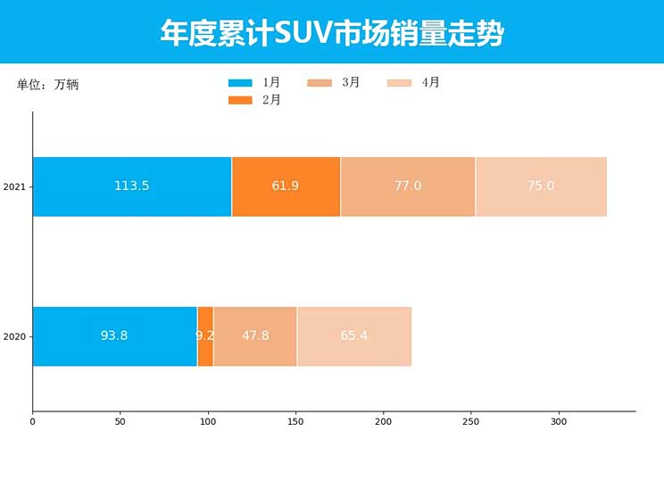 从累计销量数据来看,2021年1-4月,SUV累计销量327.4万辆,同比累计上涨51%。较去年累计情况相比,SUV累计销量增幅上涨77%。