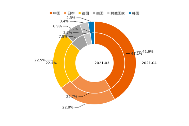 从国别情况来看,4月中国品牌SUV销量占SUV整体销量的41.9%,环比3月增长0.9%。德国、日本、美国、韩国和其他国家乘用车分别占乘用车销量的22.5%、22.8%、6.9%、2.5%和3.4%。与上个月相比,其他国家、美国品牌销量占比皆有所下降。