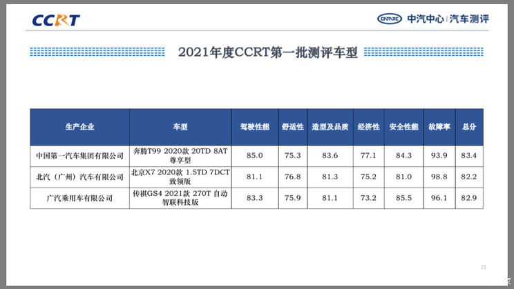 2021年度CCRT第一批评价车型车型评测结果(分)是否推荐奔腾T9983.4推荐BEIJING-X782.2推荐传祺GS482.9推荐