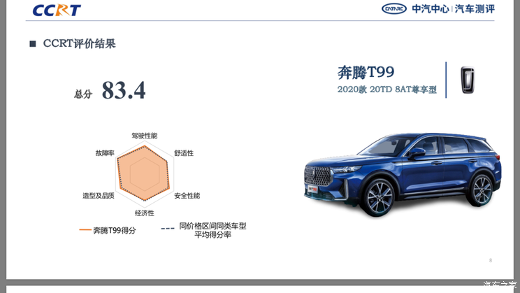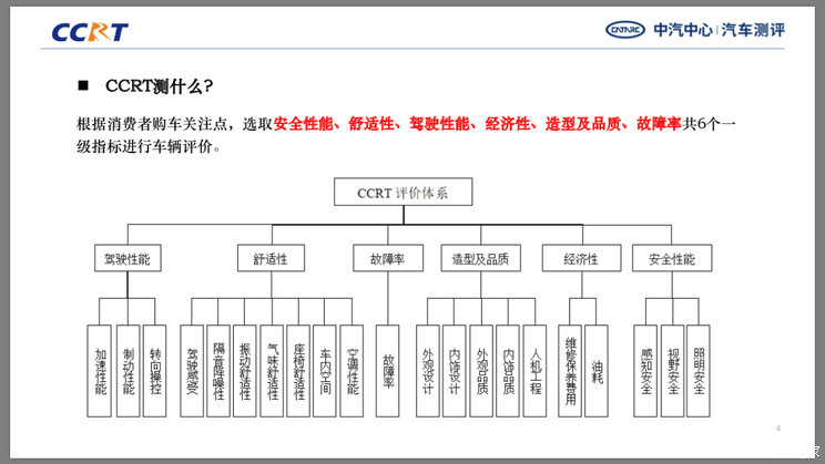 根据消费者购车关注点,选取安全性能、舒适性、驾驶性能、经济性、造型及品质、故障率六个一级指标进行车辆评价;在100分体系下,如果超过80分,为CCRT推荐车型。