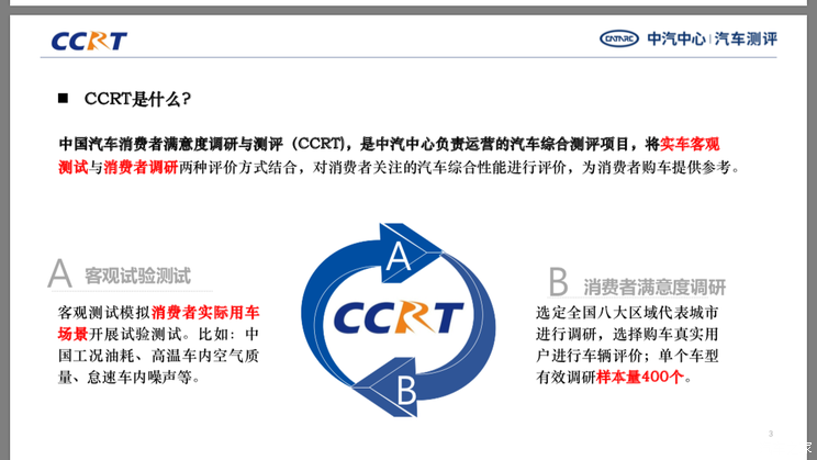 中国汽车消费者满意度调研与测评(CCRT),是中汽中心负责运营的汽车综合测评项目,将消费者调研与实车客观测试两种评价方式结合,对消费者关注的汽车综合性能进行评价,为消费者购车提供参考。其中,消费者满意度调研,选定全国八大区域代表城市进行调研,选择购车真实用户进行车辆评价;单个车型有效调研样本量400个。针对客观试验测试方面,模拟消费者实际用车场景开展试验测试。比如:中国工况油耗,高温车内空气质量,怠速车内噪声等。