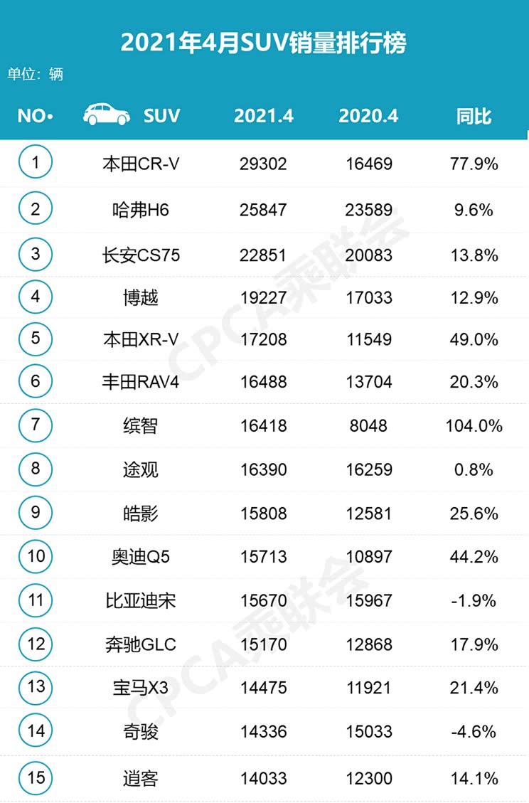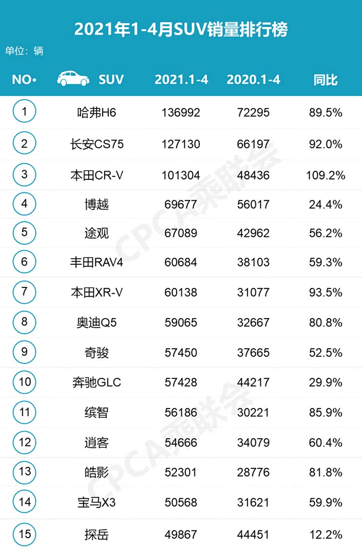 1-4月累计,SUV销量冠军则还是哈弗H6,累计销量已接近14万辆,长安CS75系列排在第二,累计销量接近13万辆,二者的累计同比涨幅也非常接近。本田CR-V排在第三。