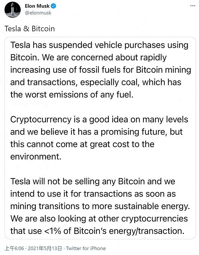 资讯 北京时间5月13日,特斯拉CEO埃隆·马斯克在国外社交媒体中宣布:“特斯拉停止使用比特币购买汽车产品,原因是担忧比特币挖矿和交易导致化石燃料,尤其是煤炭的耗用飞速增长,煤炭是所有化石燃料排放中影响最恶劣的。”受此影响,比特币价格暴跌,其余加密货币也都出现不程度的跌幅。