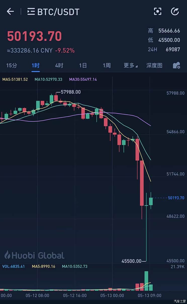 在特斯拉停止接受比特币付款消息发出后,北京时间5月13日6点左右,比特币价格开始迅速下跌,短时下跌超10000美元,最低触及45500美元,较日内高位跌去10000多美元,24小时跌幅近15.29%。不仅仅是比特币,整体的加密货币均进入下跌状态,以太坊跌幅超10%,瑞波币跌超17%,柴犬币跌幅近40%,狗狗币跌幅17%。(消息来源:金融界;编译/ 张雪莲)
