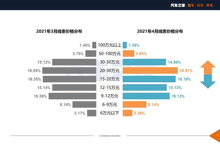 文中的“购车热度”指在相应领域的销售线索占比。销售线索不是市场销量也不是网页浏览数据,是用户通过的电话系统等,形成意向购车的条数。销售线索是离用户最后下单购车最近的一个衡量指标,对市场走势具有重要的参考、预判价值,从线索到订单会有几周或几月的延迟,如2021年1月的线索数据,除在当月被消费,部分会延迟到2021年2月-3月。