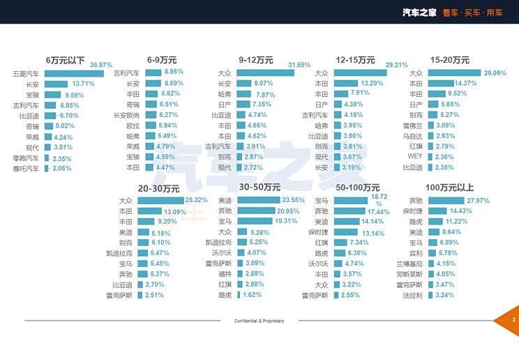 细分到不同价位的品牌层面,这里的格局依旧如同往常一般——9万元以下的低价位区间是中国品牌的主场;9-30万元区间被海外品牌占领,其中大众则是其中毫无疑问的统领者;而高于30万元区间则是以BBA为主的豪华品牌,100万元以上的超豪华品牌中也不乏保时捷、宾利、劳斯莱斯的身影。