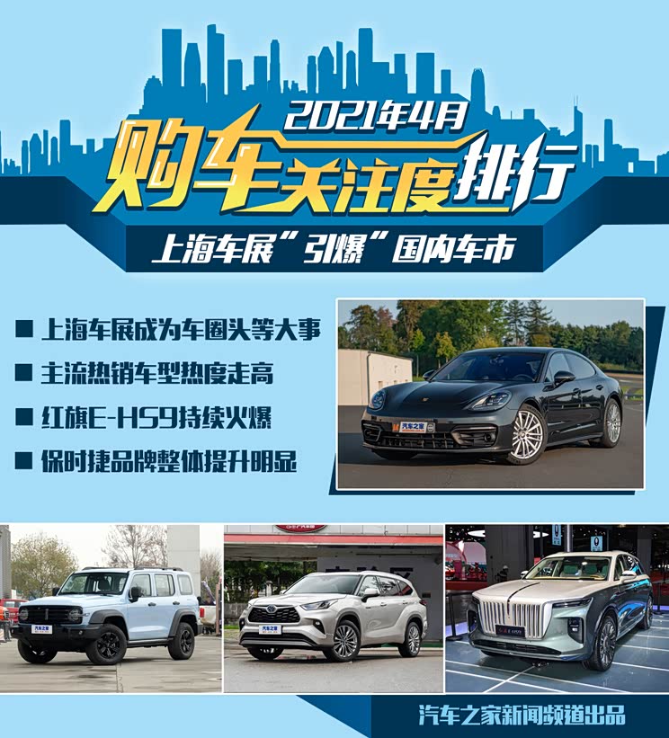 1.上海车展成为2021年车圈的“头号大事”;2.红旗E-HS9(参数|询价)/坦克300等车型持续“爆款”;3.豪华品牌市场,保时捷品牌表现突出。