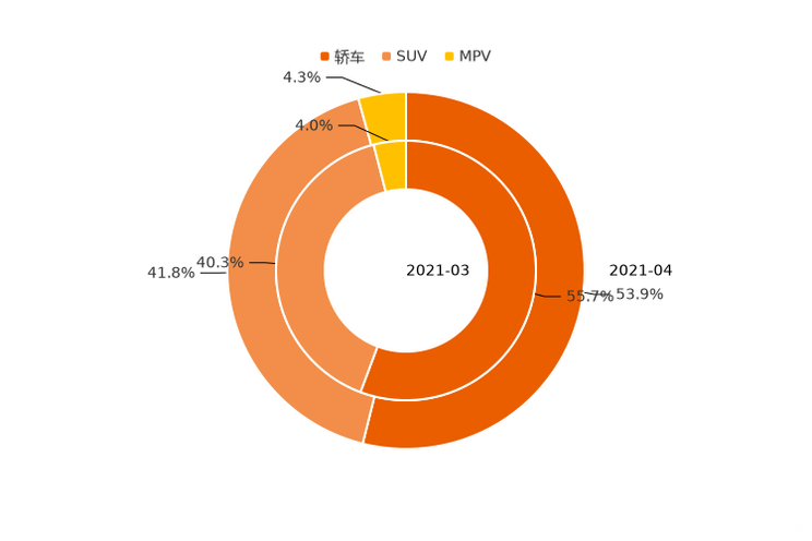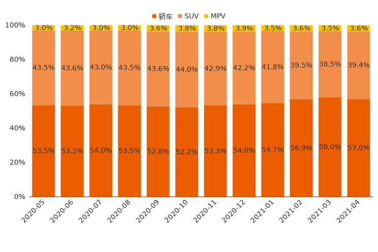 4月,轿车、SUV、MPV用户购车意向占比分别为57.0%、39.4%、3.6%。轿车用户意向占比相较上月下降1.0%。SUV用户意向占比开始转跌为升,环比增加0.9%。MPV用户意向占比相较上月上升0.1%。