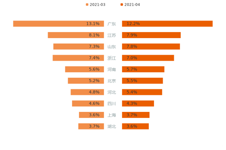 今年4月,用户购车意向占比最高的5个省份包括广东、江苏、山东、浙江、河南,广东以12.2%的意向占比独居鳌头。用户购车意向Top 10省份线索份额累计达63.1%,相较上月降低0.3%。全部省份中有12个省份用户意向占比有所增加,而11个省份的用户意向占比出现下滑,其中,河北、山东、北京相较上月用户意向占比分别增加0.6%、0.5%、0.3%,为购车意向占比增长最高的3个省份;广东、浙江、四川用户意向占比分别减少0.9%、0.4%、0.3%,为下降最多的3个省份。