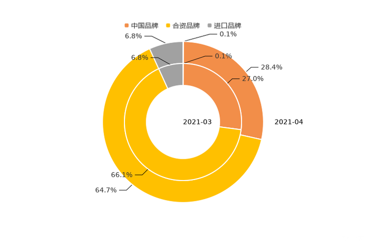4月,合资品牌用户购车意向占比为64.7%,相对上月用户购车意向占比下降1.4%。中国品牌用户意向占比相较上月,增加1.4个百分点,达到28.4%,用户热度有所升温。