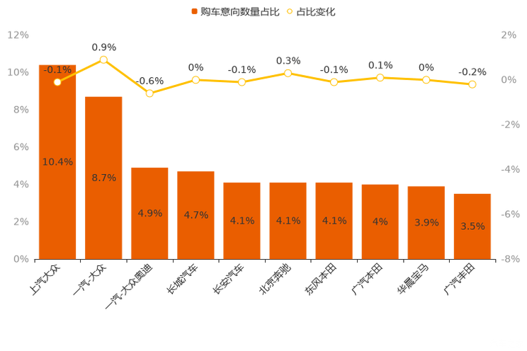 在日趋激烈的市场竞争中,各车企对于用户的争夺也是愈演愈烈。纵观4月市场,Top 10厂商用户意向占比累计达52.4%,相较上月份额增加0.2%,市场集中度进一步提升。十个厂商中,有3个厂商用户意向占比实现上涨,份额增幅最大的厂商为一汽-大众,以0.9%的增幅领涨Top 10厂商;跌幅最大的厂商为一汽-大众奥迪,下降比例为0.6%。中国品牌厂商仅有长城汽车、长安汽车跻身Top 10榜单,用户意向占比分别为4.7%、4.1%。上汽大众、一汽-大众仍为用户最为青睐的两个厂商,用户意向占比分别为10.4%、8.7%,市场榜首地位稳固。