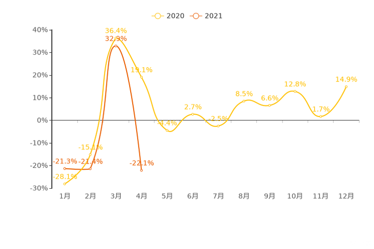 首先,我们来看一下用户整体购车热度的走势如何。2021年4月,乘用车用户意向数量环比下降22.1%。4月乘用车购车热度降温。