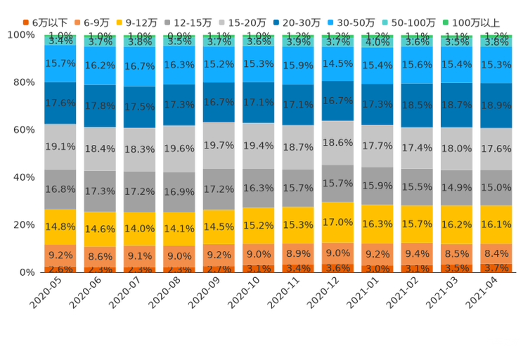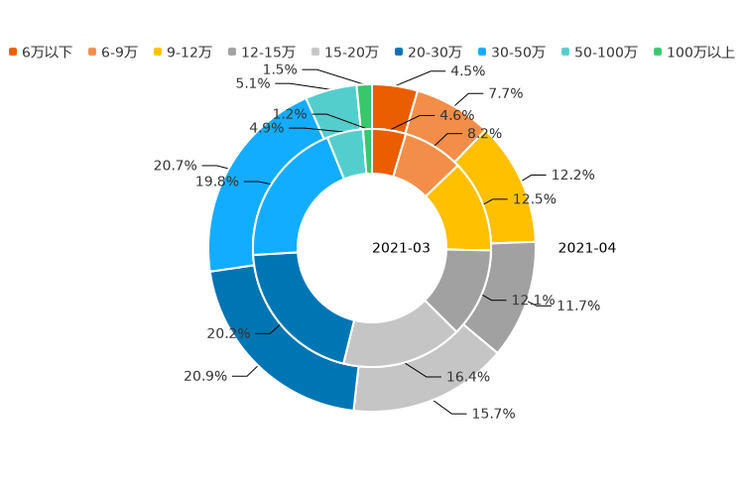 通过分析近12个月的用户意向数据发现,2020年05月至今年4月,12万以下价区用户意向占比增加1.6%,随着人们收入水平提高,低价市场热度有所升温;12-20万价区用户意向占比下滑3.3%,市场热度有所下滑;20万以上价区意向占比,上涨1.5%,其中,20-30万市场热度保持一定增长,近12个月用户意向占比上涨1.3%。