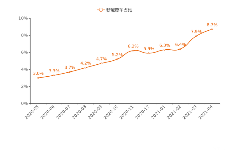 今年4月,乘用车中新能源车用户购车意向占比为8.7%,相较上月小幅上涨0.8%。新能源车近一年来迎来持续性增长,在乘用车市场新能源意向占比呈上扬态势,不断增长。