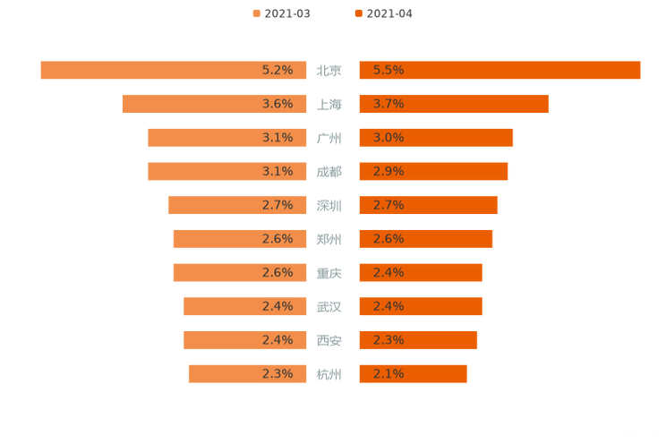 了解了用户购车意向的省份分布,我们再来看一下城市格局。今年4月,用户购车意向最高的5个城市包括北京、上海、广州、成都、深圳,北京以5.5%的购车意向占比荣登榜首。Top 10城市用户意向占比累计达29.6%,相较上月降低0.4%。全部城市中有28个城市用户意向占比有所增加。其中,北京、长春、哈尔滨相较上月用户意向占比分别增加0.3%、0.2%、0.2%,为意向占比增长最高的3个城市;东莞、重庆、成都用户意向占比分别减少0.3%、0.2%、0.2%,为下降最多的3个城市。