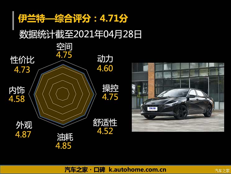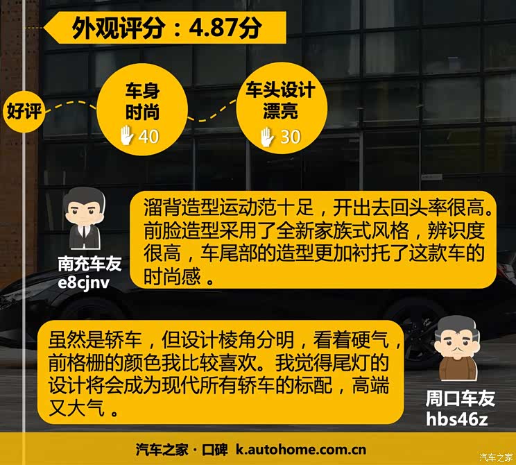● 伊兰特外观评分:4.87分集年轻、时尚、运动于一身