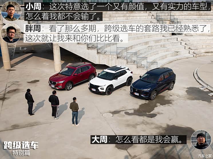 大家好,我是上海分站编辑周翱,本期《跨级选车》本来依然会由我(大周)和周楚然(小周)进行一次PK,对比的车型分别是名爵HS(参数|询价)和长安CS75 PLUS,但公司新来不久的同事周尤得知这次对比后,非要参加,并说自己会再找一辆车参加对比,就这样,本期跨级选车变成了一期特别节目,也是第一次有三辆车同时进行对比。