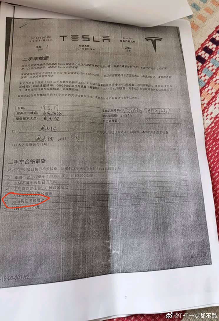 微博名为@特斯拉维权车主-韩潮表示,他本人于2019年6月5日在特斯拉官网购买了Model S P85二手车,价格为37.97万元,同时特斯拉认证二手车官方人员承诺:车辆经过200多道工序检测,不存在重大事故、火烧、水泡、结构性损伤;随后维权车主向特斯拉天津公司花旗银行对公账户打款,车辆也在天津顺利进行交付。