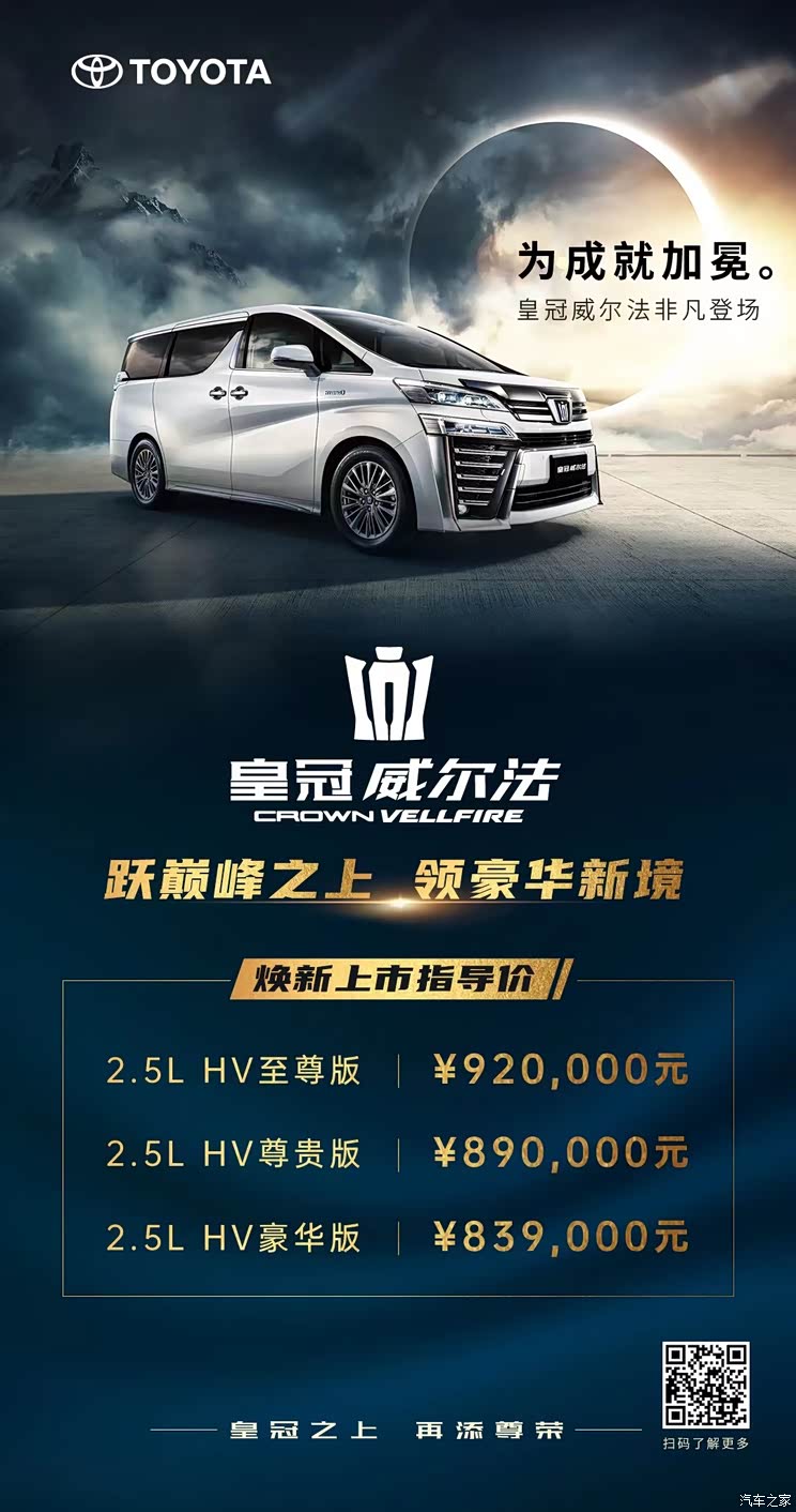 新车上市 4月19日,在2021年上海车展开幕期间,丰田官方正式发布了丰田皇冠威尔法(参数|询价)双擎车型,并同时正式上市,新车共推出3款车型,售价区间为83.90-92.00万元。新车在车型名称上冠以“皇冠之名”,并使用了海外运动版的外观套件,整车定位为威尔法的旗舰版本。