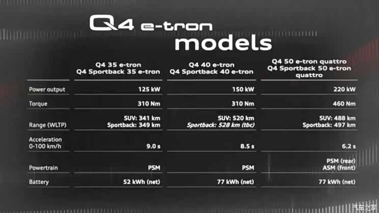 动力系统方面,新车将会有三种动力版本,分别为35 e-tron、40 e-tron、50 e-tron quattro;其中“35 e-tron”为后置永磁同步单电机,并采用后轮驱动,最大功率为170马力,最大扭矩为310牛·米,0-100km/h加速成绩为9秒,将采用52kWh的三元锂电池组,WLTP标准下SUV车型最大续航里程为341公里,Sportback车型为349公里。