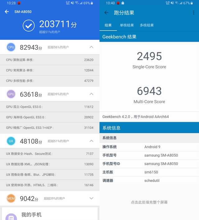 字面数据说了再多,最终还是要靠实际测试来检验能力。在安兔兔跑分中,三星Galaxy A80拿下了203711分的成绩。相信随着优化的持续进行,这一成绩会有所提高。在GeekBench跑分中,三星Galaxy A80拿下了单核2495分多核6943分的成绩,也符合骁龙730G的正常水准。
