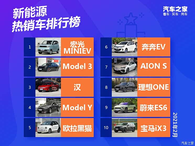 销量风云榜 日前,中国工业协会正式发布了2021年2月的全国汽车工业报告,其中2021年2月的国内热销车SUV,轿车,MPV,新能源车车型的排行榜也被公布出来。那么在2021年2月,国内新能源汽车的销量到底如何,我们一同走进这一期的销量风云榜文章了解详情。