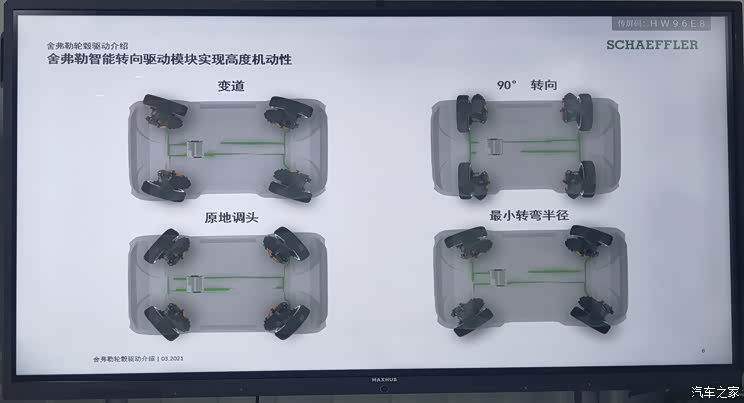 更为重要的是,由于电机直接驱动车轮,MCU(电机控制器)只需要一个简单的指令即可直接控制车轮的转速和扭矩。比如,可通过左右轮不同转速,实现电子差速减少转弯半径,或不同转向角实现原地转向,甚至侧方位停车。