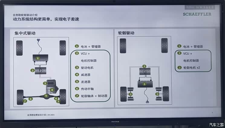 『轮毂驱动(右)比集中式驱动(左)结构更简单』