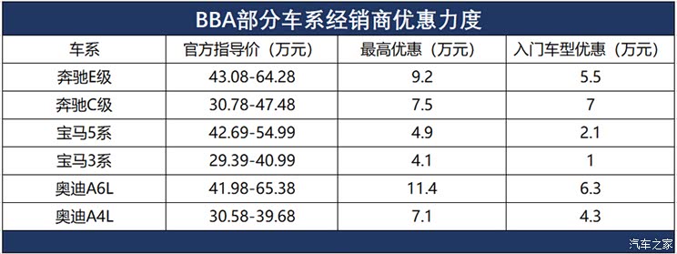 奔驰也不例外,奔驰E级上市仅半年就改款,老款车型部分经销商甚至给出了9.2万元的优惠力度;奔驰C级降价8万左右,最低配置的经销商报价30万出头;奔驰GLC降价6万左右;售价不到30万的奔驰A级优惠4.5万元。