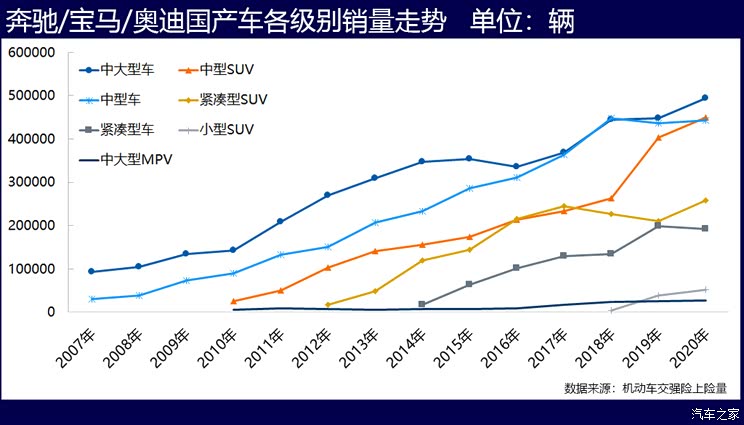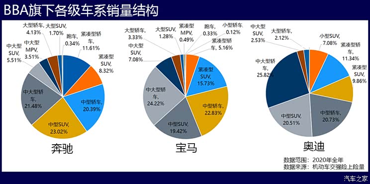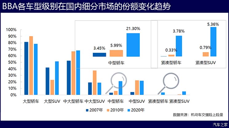 通过持续的产品导入,BBA在车型级别布局上也慢慢接地气,产品策略是其制胜的关键。从BBA各级车系在国内细分市场的份额变化趋势看,中型轿车、紧凑型轿车和紧凑型SUV市场上,BBA的份额提升速度最快——从2010年到2020年,三家紧凑型轿车合计的市场份额增长了10.5倍,紧凑型SUV的增长了5.8倍,中型轿车的增长了2.6倍。