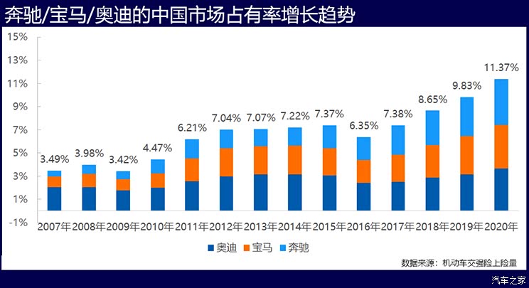 “三驾马车”虽轮流坐庄,整体又齐头并进。目前,BBA已占国内豪华汽车市场近7成的市场份额,在整体车市中的份额也从2010年的4.5%增长到了如今的11.37%。按奔驰、宝马、奥迪的顺序,2020年的市场份额分别是3.95%、3.78%和3.64%,还算是旗鼓相当,目前市场份额能超过BBA中任何一家的中国品牌,也就只有吉利和长安了。不合时宜地说下另一组数据:2018年中国品牌在各级城市的市场份额到达阶段性顶峰,其后两年开始连续下降,从平均38.18%掉到35.14%。