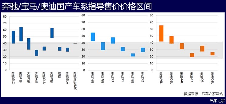 起初是携大几十万、甚至百万的车进场,如今BBA的价格已经亲民了许多。产品布局的下沉,以及国产化进场的加快,丰富的产品加上价格不断下探,BBA的市场地位得以巩固。目前BBA的主流国产车售价区间已集中到20-40万元范围内,尤其是20-30万元区间中的紧凑级车型,对其他品牌形成了巨大的冲击。这还只是官方指导价,而降价,已不仅仅是奥迪专属。